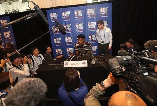 当亚当-肖华念出八村塁的名字的时候,也意味着这个孩子在第九顺位被华盛顿奇才选中,比原先的预测要稍微早一点。他展示了自己西装的内衬,一边是日本元素,一边是非洲元素,你可以从他的外表上看出来,这是个混血孩子。