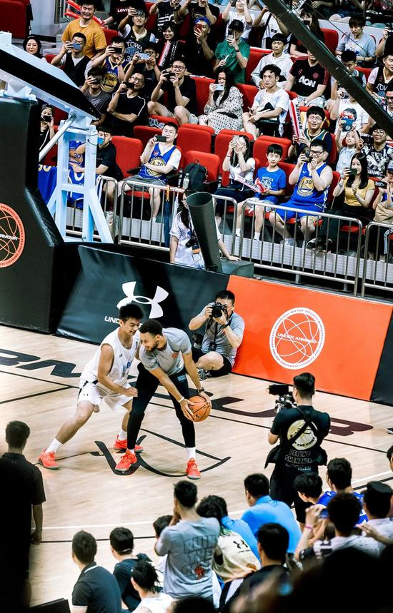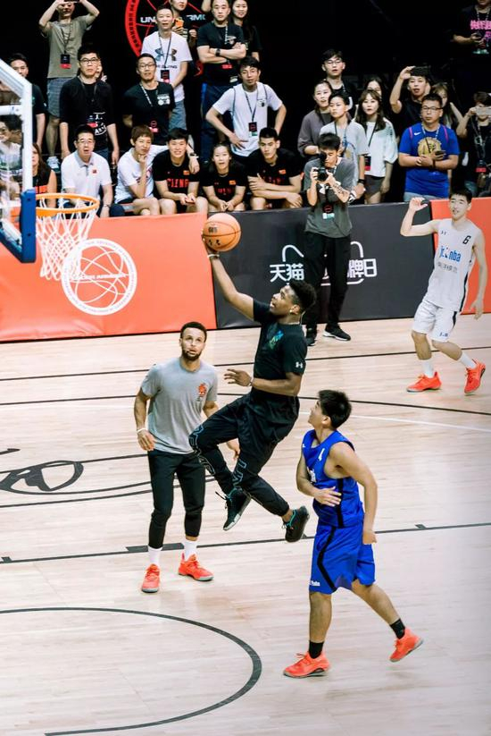这场比赛可以说是中国高中篮坛的强强对话,最后也成了她们和安德玛 sqUAd 成员一起出演的真正的巅峰盛典。这场比赛绝对是“玩真的”,比赛进入关键时刻之后,库里、恩比德、小丹尼斯·史密斯和班巴都忍不住上场比赛,贡献各种暴扣以及三分表演,炒热气氛的同时也让比分一直保持胶着。与此同时,清华附中和南洋模范的球员也丝毫不怵这些职业选手,甚至还有人在面对恩比德的防守时投进了精彩的抛射。