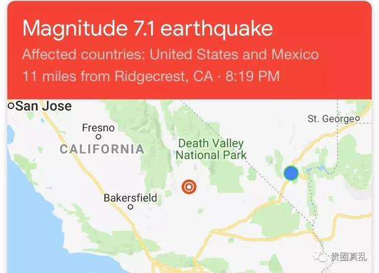 随后美国媒体马上跟进报道,加州克恩县里奇克莱斯特发生7.1级地震,震源深度11英里,拉斯维加斯震感明显 !
