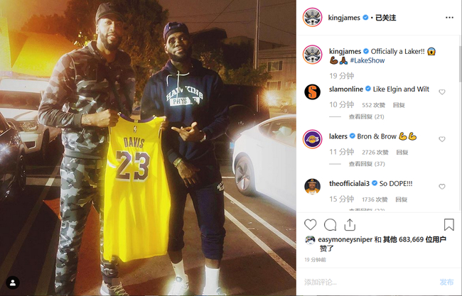 照片中戴维斯手持湖人23号球衣,詹姆斯配文道:“官宣了!这是一位湖人球员!!#湖人秀”。