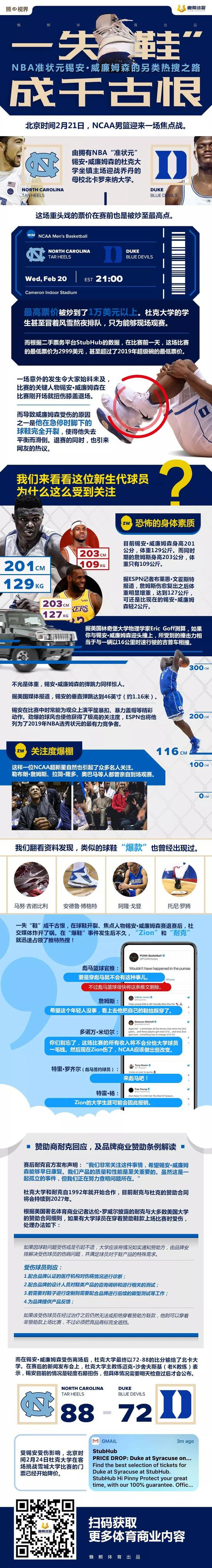 在万众瞩目的杜克vs北卡焦点战上,锡安脚下的Nike PG 2.5球鞋在一个持球转身动作后被踩穿,不幸受伤,这一负面一定程度上导致耐克股价在第二天开盘蒸发超过11亿美元。