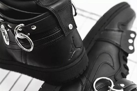 川久保玲和AJ1的联名系列分为黑&白两色,最大特点是在鞋帮处增加类似皮带和吊环设计,有一点重金属风格。