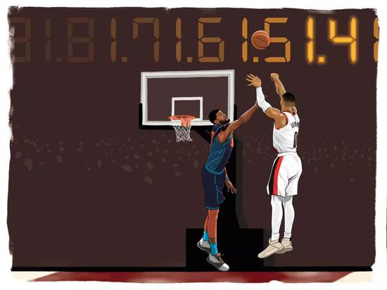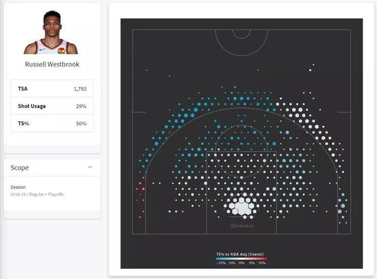 上赛季,威少占了雷霆全队出手数的29%,可他的真实命中率只有50.1%(自09-10赛季以来最低),比联盟的平均值低了6%。从投篮热区看,他几乎没一个点能投出联盟平均水平之上的命中率。在两个区域,他的命中率是全联盟最低的。