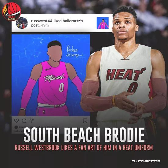 今天早晨,威少在ins上点赞了一张自己身穿粉色热火0号球衣的合成图,图下面原博主说:威少要去迈阿密了吗?