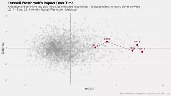 与此同时,是球队领袖威少王小二过年,一年不如一年的表现。过去三年,他保持住了三双的华丽数据,可是场上的影响力却越来越差,真实正负值逐年下滑。