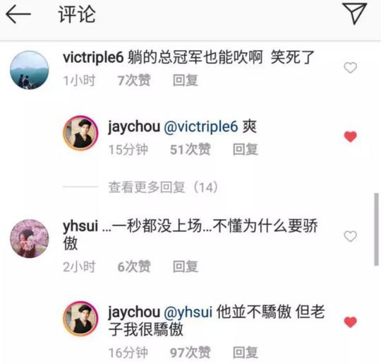 不过,也有球迷在周杰伦社交媒体下面留言写道:“一秒都没上场,不懂为什么要骄傲。”这则留言令杰伦有些不爽,他迅速回复这位网友:“他并不骄傲,但老子我很骄傲。