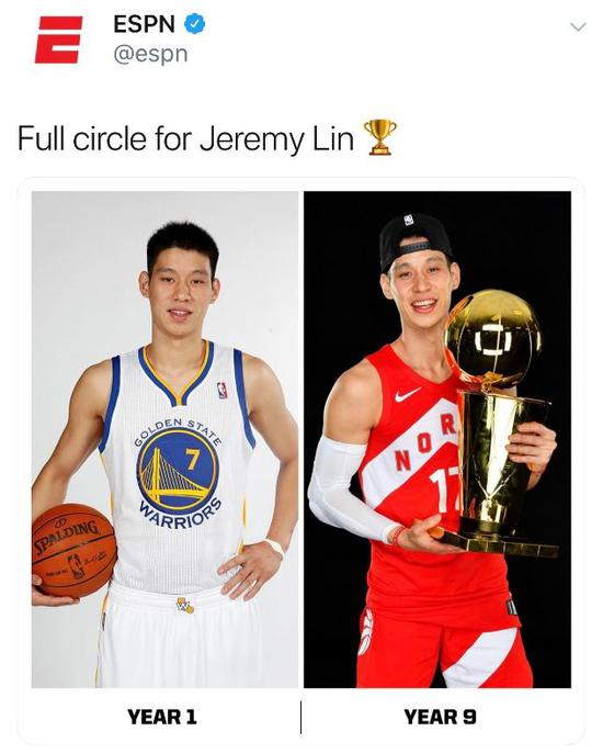 仅仅几个月过去,第一个在NBA总决赛中有过出场并最终随队夺冠的华裔球员横空出世。谁也不曾想到这一断一签,成就了林书豪9年职业生涯的人生巅峰。