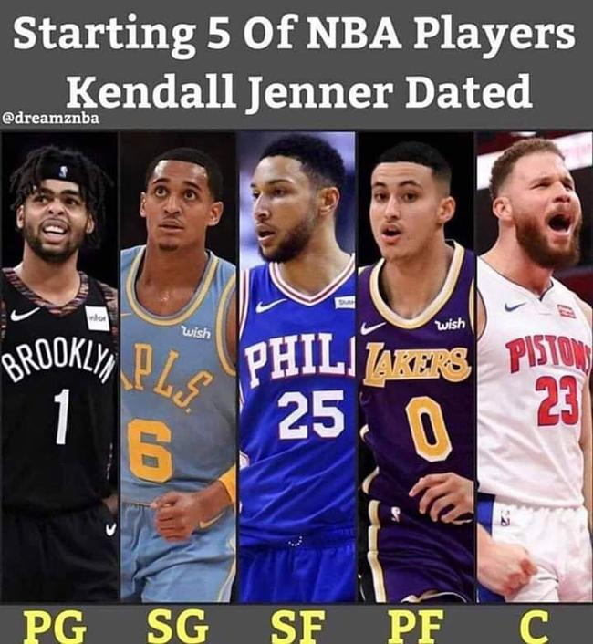 近日,推特上流传着一张肯达尔-詹娜历任NBA男友的照片,名为“肯达尔-詹娜拍拖过的NBA球员组成的首发五虎”,这五位NBA球员从一号位到五号位依次是:德安吉洛-拉塞尔,乔丹-克拉克森,本-西蒙斯,凯尔-库兹马和布雷克-格里芬。