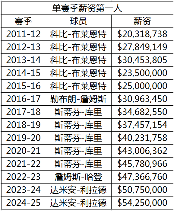 自从2016年工资帽暴涨以来,球员薪资越来越高,3000万美元年薪已经不再是件稀罕事,斯蒂芬-库里新赛季将领到4023万美元工资,成为NBA历史第一位年薪超过4000万美元球员。