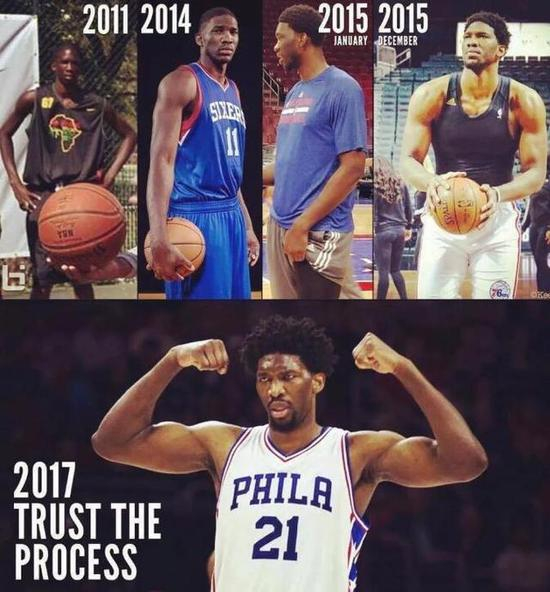熟悉恩比德这名球员的球迷一定知道他直到16岁才正式的接受篮球训练,早年的他其实主练的运动是足球。而刚开始练习篮球的恩比德由于身体过于瘦弱导致一直在对抗方面吃亏,不过,在经过几年的合理增重后,进入联盟时的恩比德已经初露峥嵘。时至今日,恩比德已经成为场均27+13的内线巨兽,对比他进入联盟前和现在的照片简直判若两人。