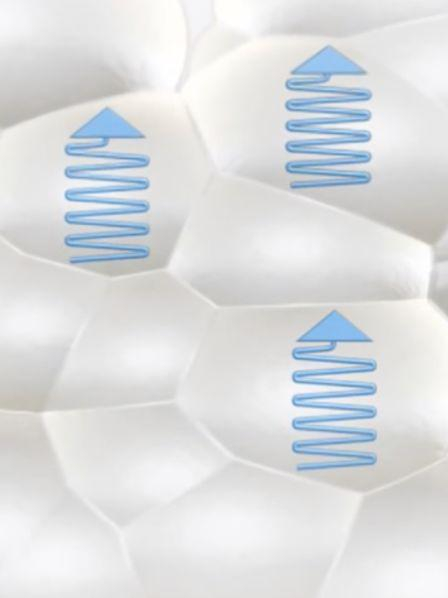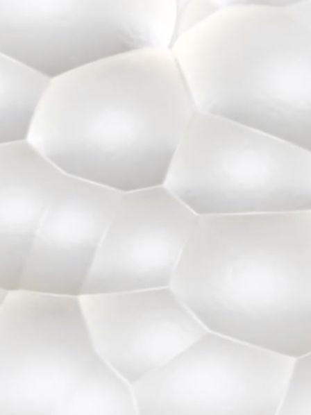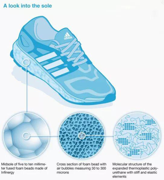 2007年,随着Infinergy™的诞生,以上两个较为传统的发泡材料的问题算是得到了较好的解决。Infinergy™的本质,是热塑性发泡聚氨酯颗粒(E-TPU——Expanded Thermoplastic Polyurethanes)。E-TPU通过发泡原料TPU颗粒制造,在经过压力和加热预处理后,每个的颗粒就像爆米花一样被炸开。在这个过程中,它的体积增加了十倍,生产出内部有微小封闭气泡的椭圆形泡沫珠。这些密封的气囊使轻质泡沫珠非常有弹性,并提供所需的回弹效果。单个小的颗粒中,都封装着一定量的的空气,而每一块adidas所采用的鞋底,都包含数以千计的这样的小颗粒。为了将它们转化成所需的形状,BASF用热蒸汽处理它们,颗粒的最外层稍微熔化,使它们粘合成稳定的形状。值得注意的是,在这个过程中,颗粒内部的气囊结构并不会受到此过程的影响。如此看来,这种E-TPU材质的鞋底,像是一种含有无数分割气室的‘气垫’。