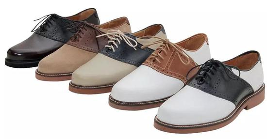 最经典的Saddle Shoe采用白色绒面革鞋面,搭配黑色优质皮革“马鞍”打造。后来因为白色绒面革易脏且不好打理,逐渐由米色绒面革代替。再往后演变,就出现了更多的材质和颜色变化,并加入了布洛克雕花、鳄鱼纹、高跟等元素。