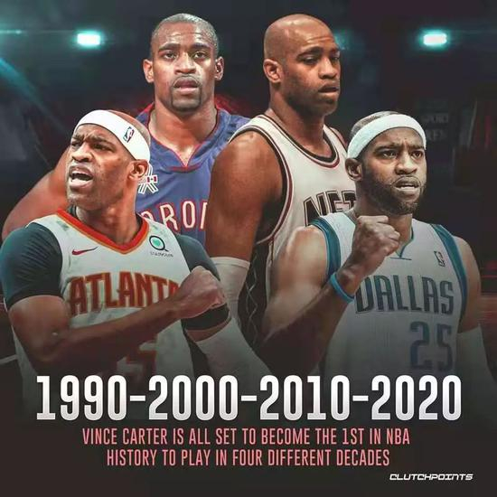 那一年,谁会想到,那个被买断的过气巨星,像换了个人一般,从曾经的半人半神,参悟到了半人半佛的境界呢?每年,都有人想问,那个长者还能出现在下个赛季么,卡特扶了扶眼镜,说到:再续一秒,就这么一年又一年,卡特从被买断的那年熬到2020年,他也成了NBA历史第一个能出现在四个十年的活化石级别球星,放眼美国四大联盟,也只剩下三个90年代球员。
