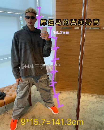 Mak王子:已知iPhone Xs Max长15.7cm,由此可证库兹马穿鞋身高为141.3cm,实际脱鞋不足一米四