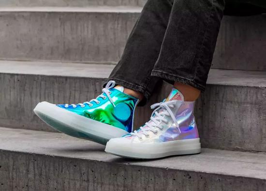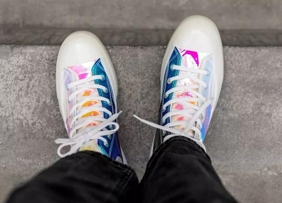 这双变色龙 Converse 在年初首发后,曾经身价倍翻到 3000 元左右,如今回落了不少。鞋身以炫彩亮面装扮,在光线照射下,呈现出极为炫目的视觉效果。同时采用类似 OFF-WHITE × Converse 的透明外底,还露出淡蓝色橡胶,独特又新颖。