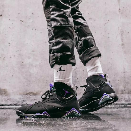 Patta 联名同样让 Air Jordan 7 重现在大家的种草清单中。而这双雷阿伦 Air Jordan 7,不仅再现了的专属 PE 配色,质感十足的黑色牛巴革鞋身点缀紫色和灰色细节,也是帅气又骚气的秋冬穿搭精品。