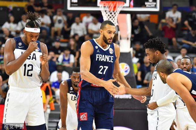 到了淘汰赛阶段,两队都是倾其所有。法国丝毫不怵,开场后打得很稳,凭借内线戈贝尔的高度,大部分时间压制美国。