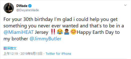 “为了你的30岁生日,我很高兴我能帮你得到一些你永远不想要的东西,那就是穿上迈阿密热火队的球衣!祝我的兄弟生日快乐@吉米-巴特勒”韦德今天在推特上写道。