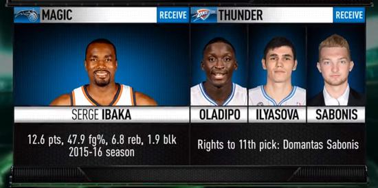 2016年雷霆与魔术完成一笔交易,送出伊巴卡得到了魔术的奥拉迪波、伊利亚索瓦和11号秀小萨博尼斯。这笔交易从现在看,绝对是大赚!只不过这仨人,雷霆也是一个没留住。。。。。。