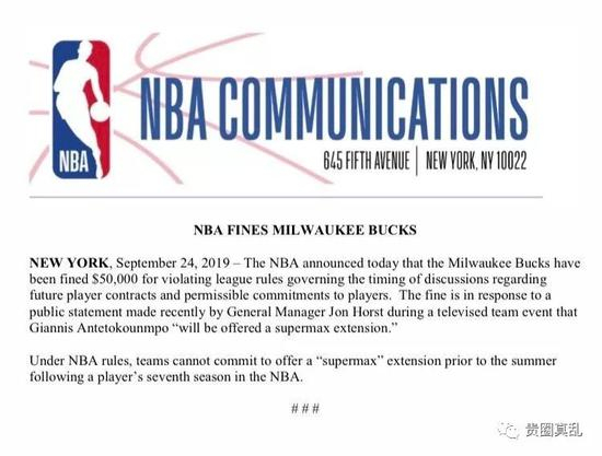 联盟官宣公布,雄鹿在不当时间发表有关字母哥的合同言论,被处以5万美元罚款!
