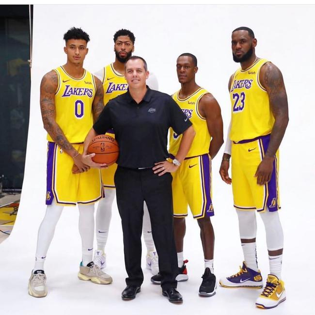 北京时间9月28日,今天是洛杉矶湖人的媒体日,勒布朗-詹姆斯、安东尼-戴维斯、凯尔-库兹马、拉简-隆多和新帅沃格尔一起拍摄定妆照。