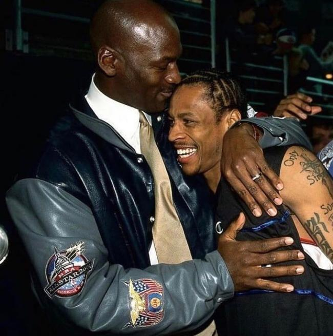 今天,艾弗森就更新ins,晒出他当年和乔丹在全明星周末期间的合照。照片中,乔丹身穿全明星外套,一把将艾弗森揽入怀中,艾弗森则是笑得合不拢嘴,一副小鸟依人的模样。