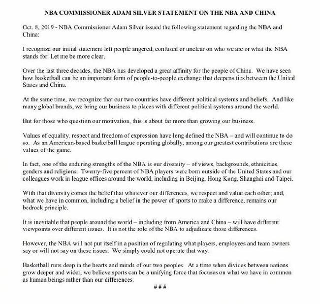 北京时间10月8日,NBA总裁亚当-肖华就NBA和中国发表了如下声明: