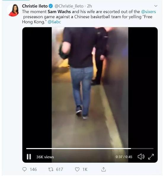 就在几小时前,在美国NBA球队“76人”与中国广州龙狮队的一场季前赛中,一名美国男子和他的妻子竟然携带支持香港骚乱的政治标语出现在赛场内。