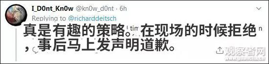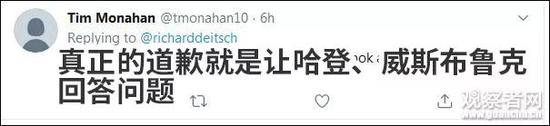 不过,NBA高级副总裁蒂姆·弗兰克后来还是打电话给麦克法兰,亲自为此事道歉。 这之后,NBA又发了一份声明道歉:“在今天休斯顿火箭队的媒体发布会上,一名球队代表不合时宜地插话,阻止CNN的克里斯蒂娜·麦克法兰提问。我们已经向麦克法兰女士道歉,因为这与NBA的媒体活动不一致。” 据《华盛顿邮报》消息,麦克法兰随后回应表示“感谢你的道歉”,并说,“他们在非常困难的情况下尽了最大的努力。对于如何回答这类问题,他们感到很矛盾。” 在国外社交媒体上,不少网友就上述CNN记者事件展开讨论。有人认为NBA的公关太糟糕了,但也有人不认同CNN的做法。 NBA这不算道歉,除非要哈登来回答: