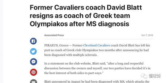 3天前,希腊俱乐部奥林匹克亚斯宣布主教练大卫-布拉特离职,原因是多发性硬化症,需要长期治疗。