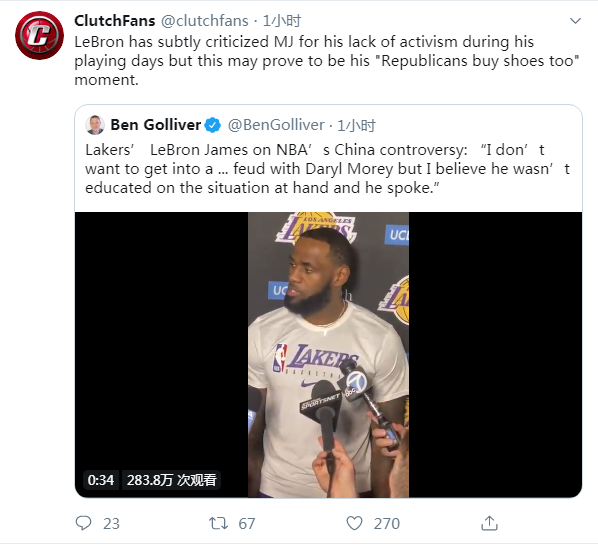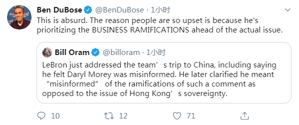 以下是推特上一些NBA媒体对詹姆斯评价莫雷事件的抨击:
