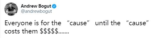 澳大利亚中锋博古特今天也在推特上写道:“每个人都为了一个原则,除非这个原则会让他们失去金钱。”言下之意,詹姆斯因为看重金钱而不敢为莫雷事件发声。