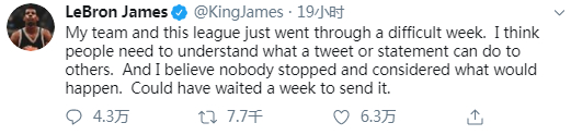 昨天,詹姆斯第一次公开评论莫雷事件,他认为莫雷在被误导或者不了解事件真相的情况下发布了那条推特,而且没有考虑到这条推特可能会引发的后果。