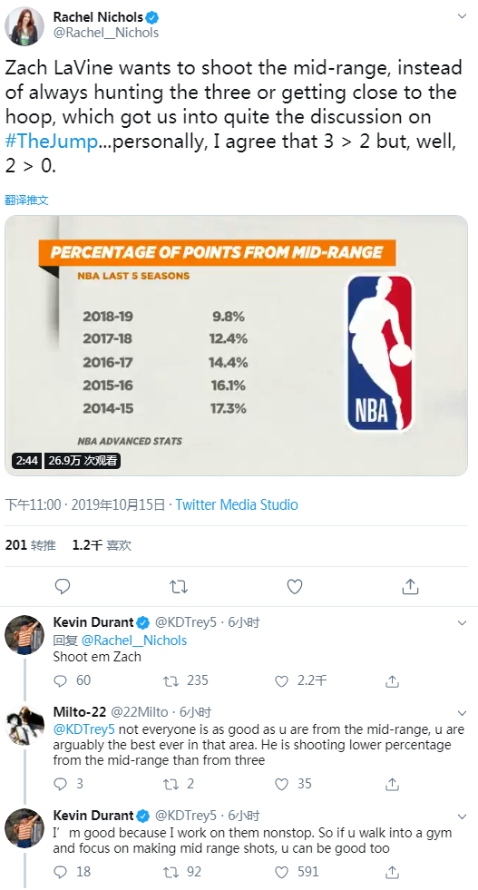 “有时候这就是一个空位投篮。为什么要放弃一个空位的中距离而去追求有人防守的三分?”杜兰特在推特上写道。