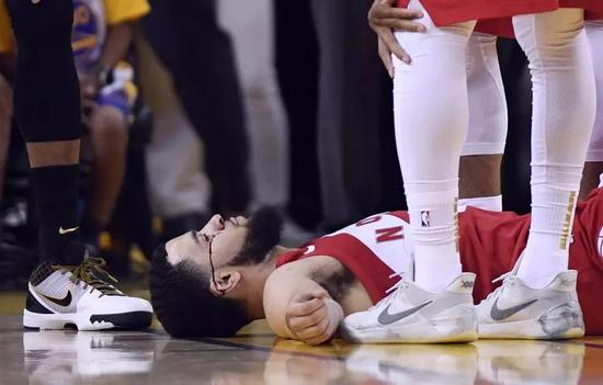 范弗列特平躺在篮筐下,鲜血从他的眼角流下来,这是2019年NBA总决赛的标志性镜头之一。肖恩·利文斯顿的手肘让范弗利特的眼角缝了七针才好,他将永远留下一道伤疤。