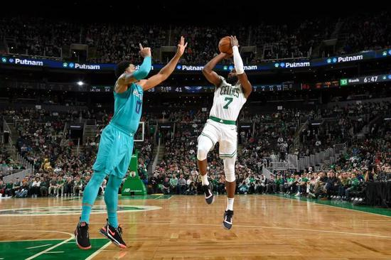前文就已经提到过的,布朗是一个在进攻端拿不出什么杀手锏的球员,三分跟控球都不算出色,进攻端除了靠身体硬吃错位,面框运两步直接炸筐之外,你很难说他有什么招式是无法被对手限制的。但在签订了这份合同之后,你就得明白,在凯尔特人对于未来的规划里,他们至少是把布朗放在了一个核心支柱——至少是之一——的位置上的。所以,他得在唯一可靠的防守基础之上,再增加点什么,才能配得上这份期许。在我看来,更加稳定的三分威胁,是立住脚跟的根本。以过往的经验来看,塔图姆是这支球队在锋线上的绝对持球主力,控卫一角上虽然已由先前的欧文替换成了如今的沃克,但以持球进攻为主,且更喜欢个人终结得分的球风是没有改变的。就算将杰伦-布朗的进攻优先级往上提,撑死了也就是个三号人物,他还是很难在短时间内就获得大量的自主进攻权的。所以,想办法把3D属性先落实好,才是眼下的关键。他不是没有做好过这些事的。2017-18赛季的杰伦-布朗,就曾是一个在投射上做出过上佳表现的球员,他的三分命中率接近4成,场均能够命中1.7记三分,定点跳投的得分效率优于84%的球员,对于空位三分球的把握,也有着44.1%的稳定表现。