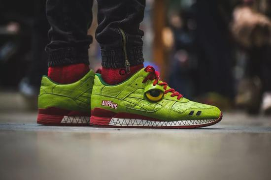 • > 在2007年,来自纽约的街头品牌Alife与ASICS携手推出了一款Gel-Lyte III‘Green Monster’特别版本。鞋款四只硕大的眼睛被放置在鞋身两侧,吸睛度十足。而且鞋中底部位的一排锋利牙齿的线条设计也是十分讨巧,好像这个小怪物随时要开始寻找猎物一般。该鞋款共释出三款配色方案,黑色、米白色和绿色的运用诠释了不同版本下的怪物形象。