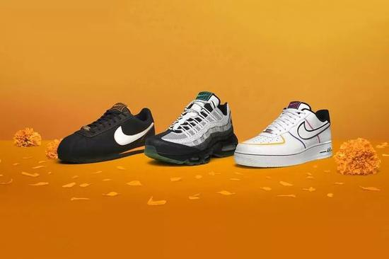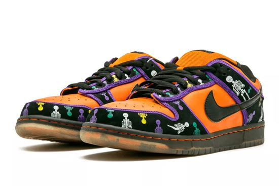 • > 2009年,Nike推出的Day Of The Dead套装一定是很多鞋迷们的心头好。Nike Dunk Low采用浅紫色和绿色的搭配,在整个鞋身上布满骷髅的图案。Nike Dunk High则运用相同的设计,主体色调改为黑色呈现。最后一款Nike Air Max 90运用独特的彩绘元素在此系列中脱颖而出。整个套装以墨西哥一年一度的亡灵节为灵感来源设计,在当年限量发售引起了不小的轰动。