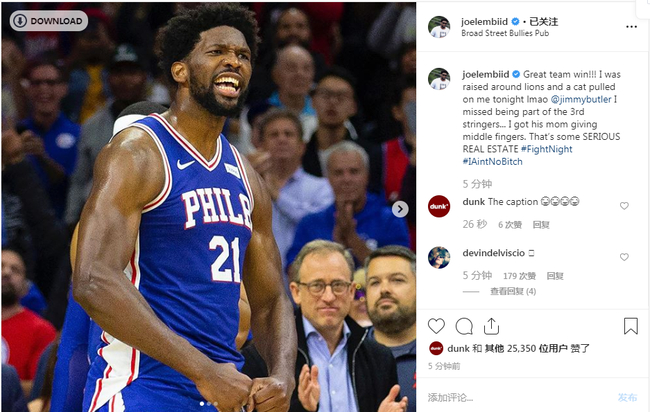 “伟大的球队胜利!我从小和狮子一起长大,今晚一只猫挑衅我,笑死我了!@吉米-巴特勒,我很想成为三流阵容里的一部分。他的母亲还对我竖中指。#格斗之夜#我不是好惹的”恩比德在IG上晒出一张他在比赛中的照片,并写下这段话。