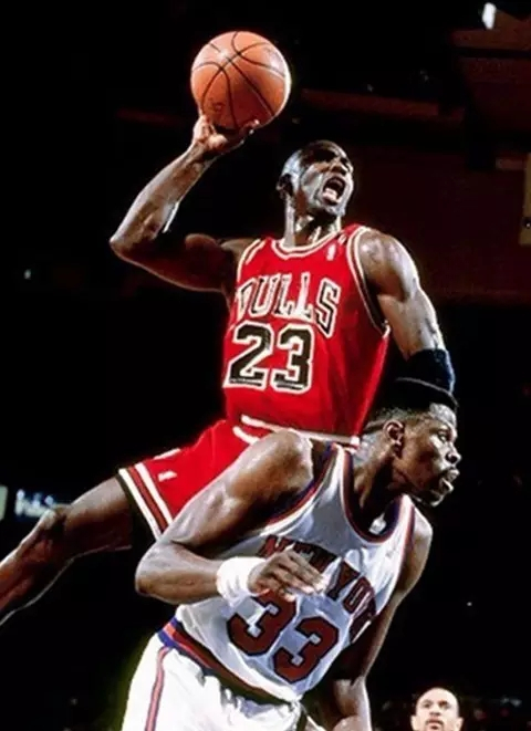 乔丹在底线使用假动作晃开了防守他的奥克利,迎着补防过来的尤因,在身体接触之后,纵身跃起右手单手劈扣得分,震惊了整个麦迪逊广场花园球馆!