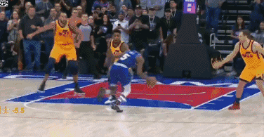 当画面转过来,福克斯带球突入禁区,分球至底角的别利察手中,别利察扔出三分,但球弹框而出,此时斜刺里的巴恩斯突然杀出,直接飞身补篮命中,国王就此完成反超,比赛时间只剩下2.9秒。