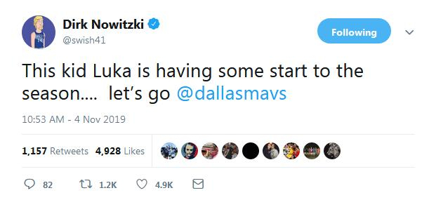 看到东契奇如此出色的表现,今年夏天退役的独行侠传奇德克-诺维茨基也忍不住在推特上称赞东契奇:“这个叫卢卡的孩子在赛季开局打出了一些非常出色的表现,让我们加油@达拉斯独行侠”