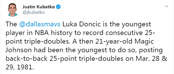 据统计,东契奇成为了NBA历史上连续得到25分三双的最年轻球员。之前的纪录由“魔术师”约翰逊保持。1981年3月29日和30日,当时才21岁的“魔术师”连续2场比赛得到25分三双。
