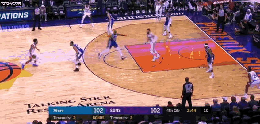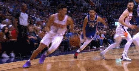 半分多钟之后,布克再次单挑西蒙斯,他在突破的时候突然停顿了一下,然后继续加速,这个停顿让西蒙斯在防守时失去了节奏,结果布克在篮下轻松得分。