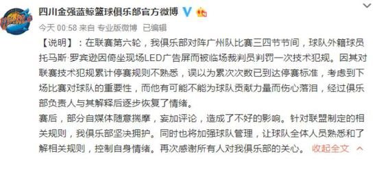 第二天四川男篮官方给出的声明当中表示,托马罗是误以为自己的这个技术犯规会让自己达到停赛标准,缺席下一场比赛,不能为球队贡献自己的力量而崩溃。这么解释,托马罗是个很单纯的人。