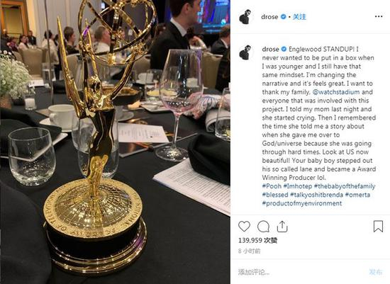 “当我还比较年轻的时候,我从来没有想到能够获得这个奖,我现在仍然是这样的想法。谢谢我的家庭和参与到这一项目的每一个人。昨天晚上,我告诉母亲这个消息,她哭了起来。你的男孩现在站出来,完成了跨界,获得了艾美奖制片人奖。”