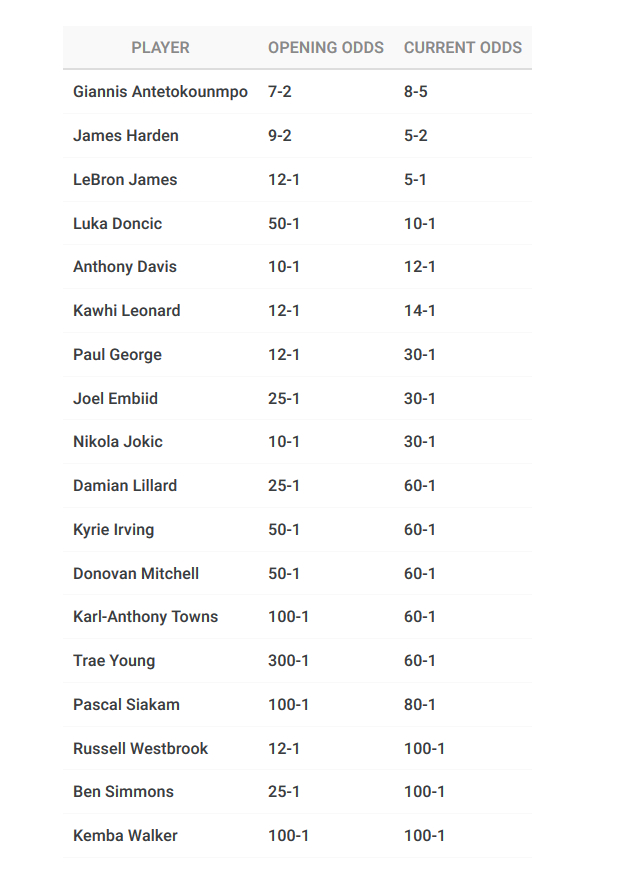 目前排在常规赛MVP赔率榜前两位的依然是字母哥和哈登,赔率分别是5赔8和2赔5。