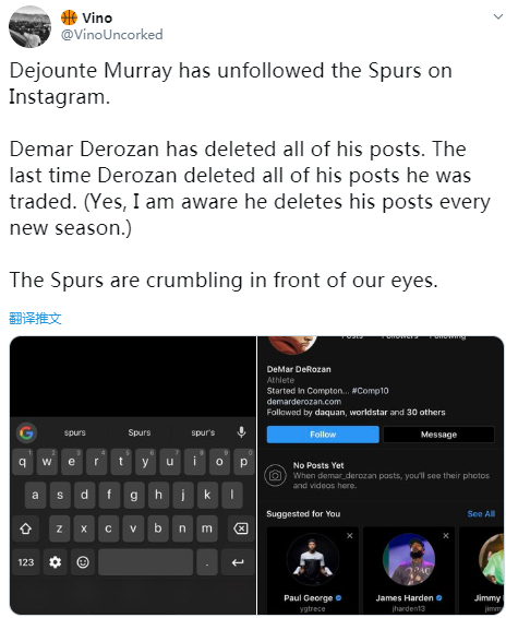 昨天赛前就有媒体报道,马刺首发得分后卫德罗赞已经清空了他的IG内容,而德罗赞上一次这么做,他被猛龙队交易。