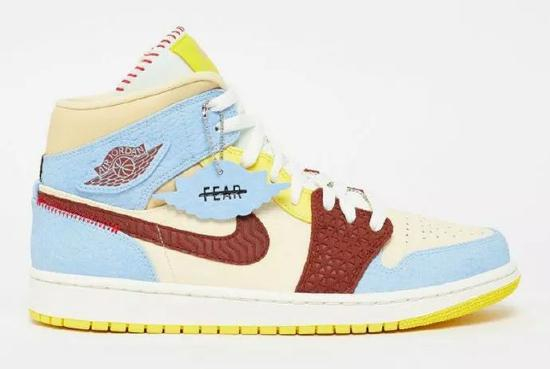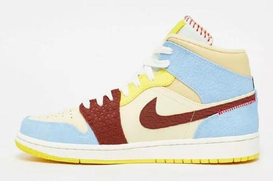 巴黎品牌Maison Château Rouge擅长使用野性图案和各种鲜艳的色彩而广受赞誉,这双AJ1 Mid使用较柔和的黄色和蓝色调,柔和的棕色和皮革上的浮雕图案源自他的非洲根源。