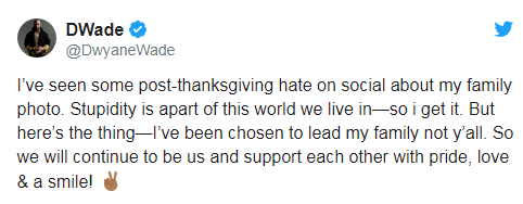 于是,韦德给予了回应:“我在社交媒体上看到一些关于在感恩节的时候仍然对我的全家福充满敌意的言论,愚蠢有时候是我们生活在这个世界上的一部分。然而,这就是事实,我仍然是这个家庭的主心骨,我们依旧是我们,并且将继续保持骄傲、爱与微笑,并且一直相互支持!”